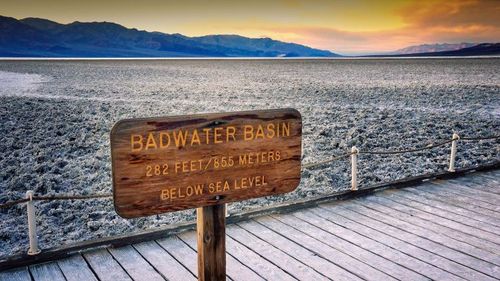 The pool is not the lowest point of the basin: the lowest point (which is only slightly lower) is several miles to the west and varies in position, depending on rainfall and evaporation patterns. The salt flats are hazardous to traverse (in many cases being only a thin white crust over mud), and so the sign marking the low point is at the pool instead. Despite Laguna del Carbón in Argentina having an elevation of −105 meters (−344 feet), Badwater Basin is often mistakenly described as the lowest elevation in the Western Hemisphere.