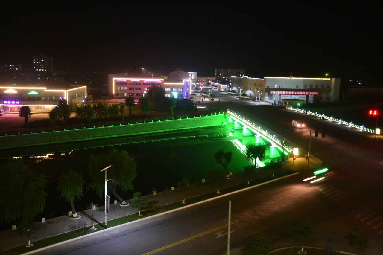 Na první pohled je tady víc prachů. Normální benzínky. Víc aut. Lepší cesty. Do toho ale stále rudé slogany a portréty a sochy vůdců. Pořád jsme dost jasně v KLDR a jako Hong-Kong to tady rozhodně nevypadá. Náš hotel Tourist je celkem OK, má pár much, hlavně teda kombinace pokojů ve čtvrtém patře bez výtahu a dvacetikilových kufrů není úplně optimální, a to jako správný rudý gentleman těch pater s kufrem svým i křehkých dam vyjdu asi deset. Ale je tu teplá sprcha.