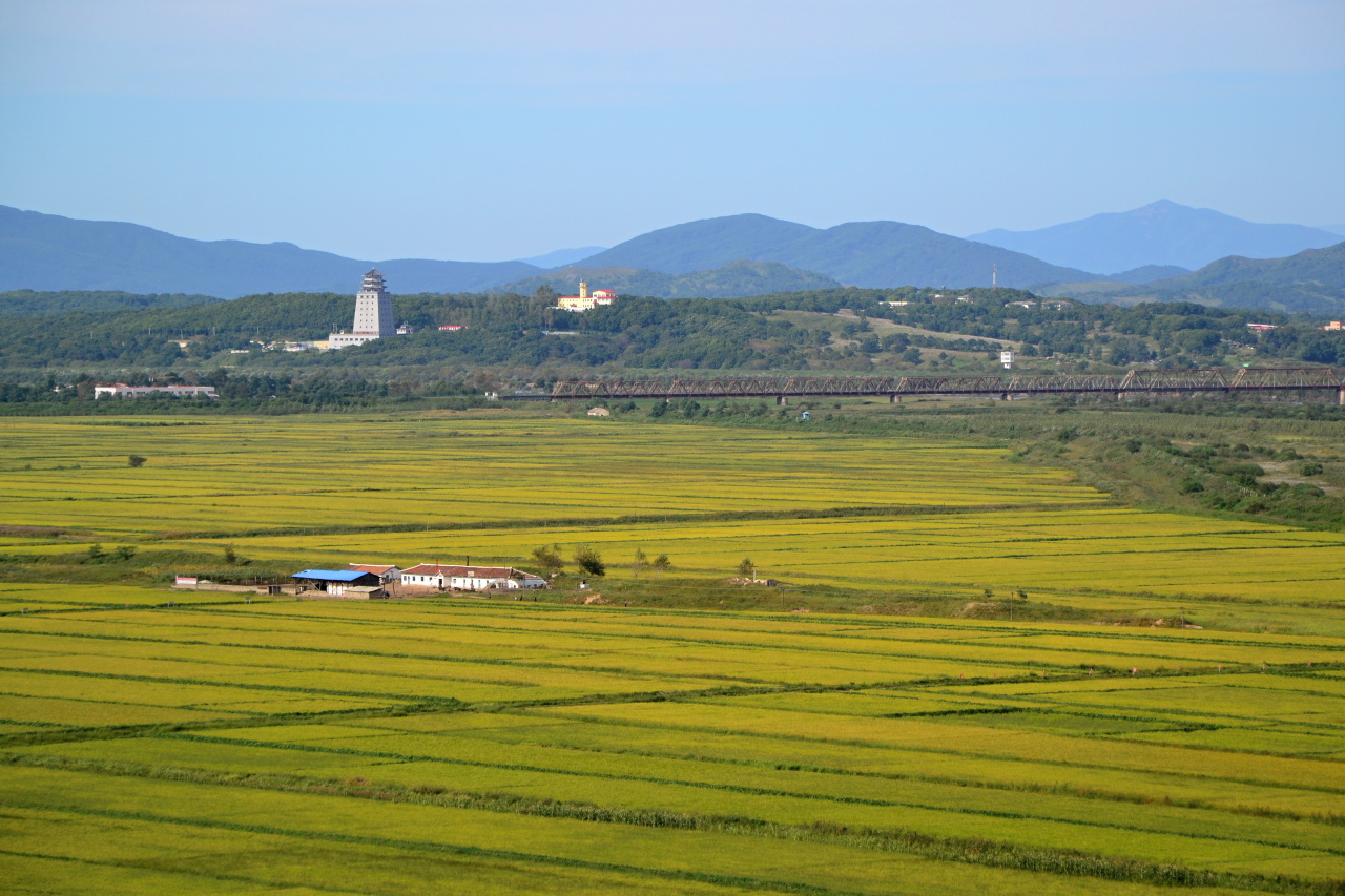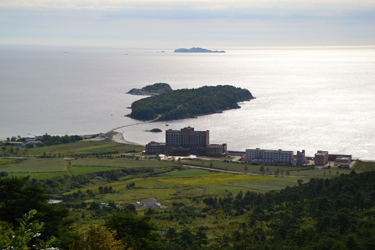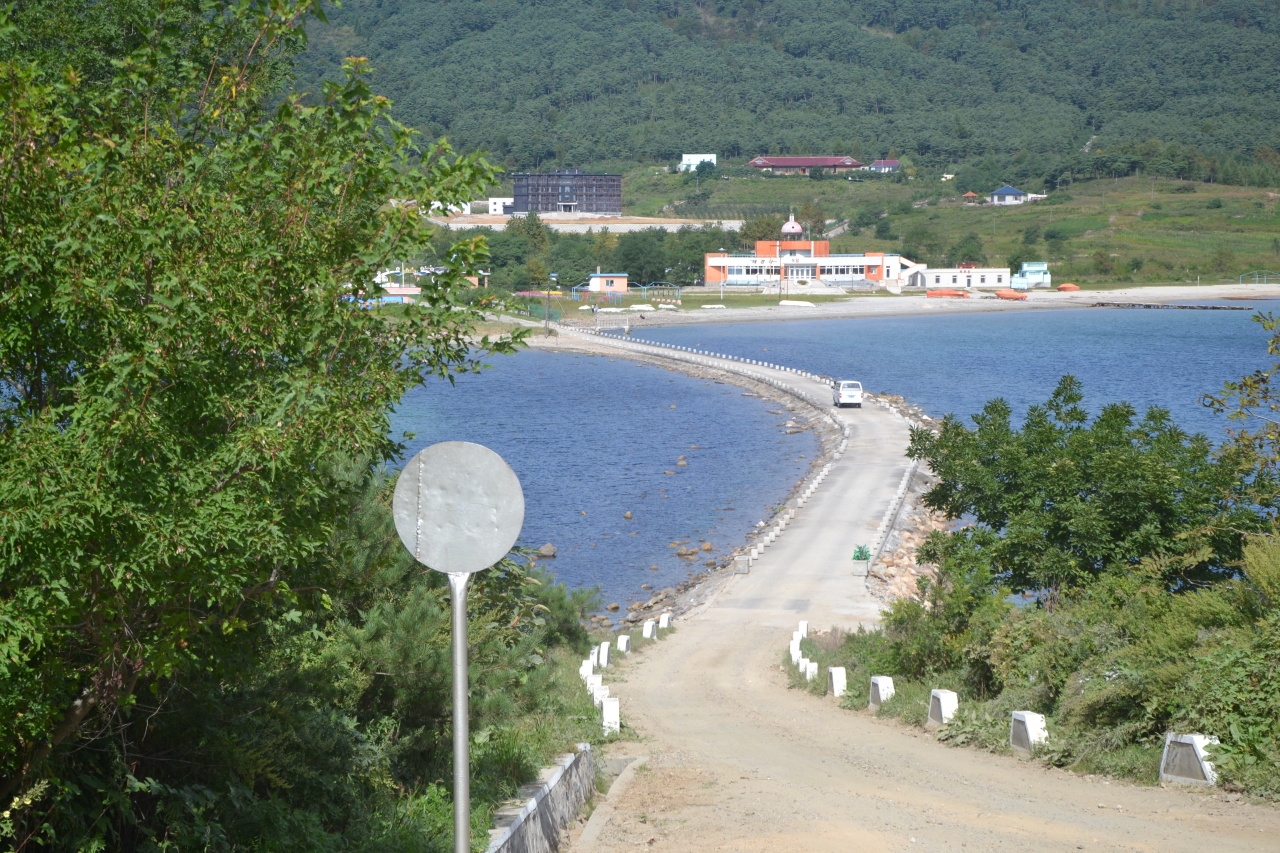 Next stop, hurá, oběd, same same but different, hlavní chod je kari které vypadá jako z pytlíku od Vitany. Pak už konečně jedeme na konec světa, do Tumangangu, poslední vlakové stanice před hranicí s Ruskem. Znám to tady z ruské strany, kdo sledujete Čočíkovy reporty asi znáte i čínskou stranu. A teď konečně z KLDR. Je to nutno povědět lepší než z Ruska. Je tu výhled daleko do vnitrozemí, dalekohled zadarmo, vyhlídkový pavilón. Staví se sem betonová cesta, takže musíme kus jít, a pak kus zpět k autobusu. Nikomu to nevadí, lepší, než revoluční místa. Cesta je nová a zabalená v celofánu.