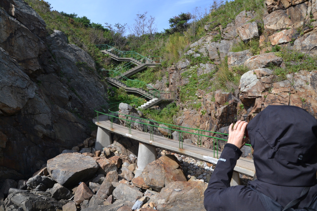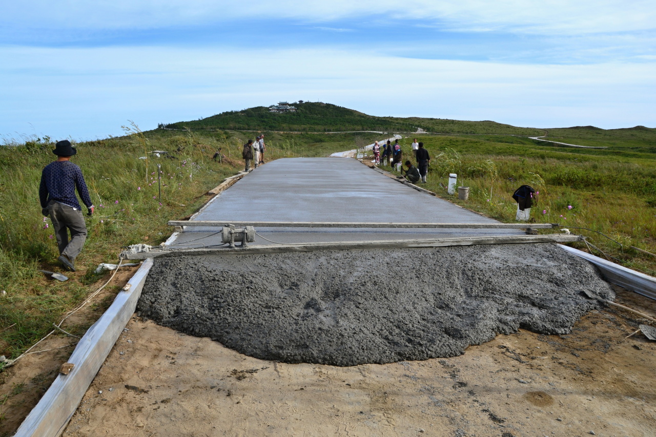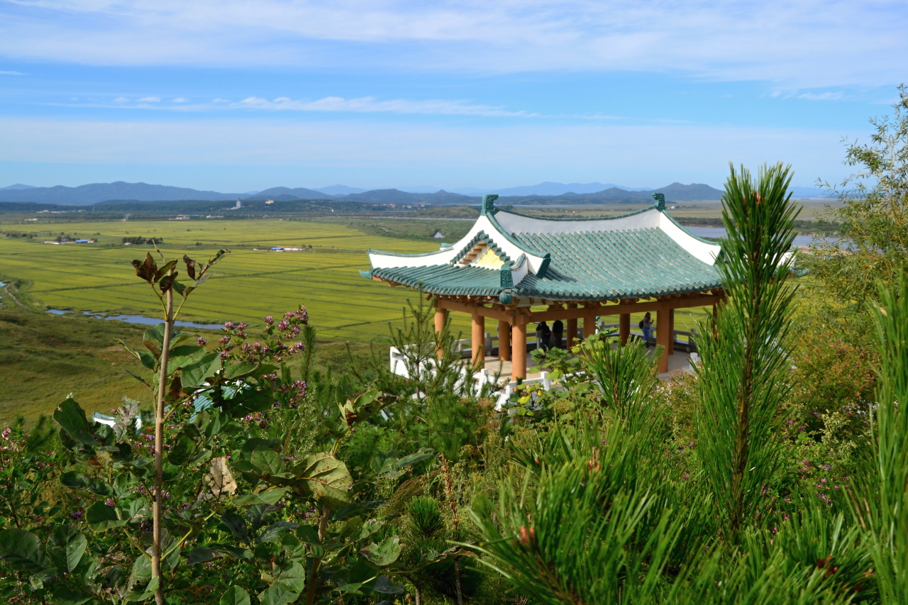 Next stop, hurá, oběd, same same but different, hlavní chod je kari které vypadá jako z pytlíku od Vitany. Pak už konečně jedeme na konec světa, do Tumangangu, poslední vlakové stanice před hranicí s Ruskem. Znám to tady z ruské strany, kdo sledujete Čočíkovy reporty asi znáte i čínskou stranu. A teď konečně z KLDR. Je to nutno povědět lepší než z Ruska. Je tu výhled daleko do vnitrozemí, dalekohled zadarmo, vyhlídkový pavilón. Staví se sem betonová cesta, takže musíme kus jít, a pak kus zpět k autobusu. Nikomu to nevadí, lepší, než revoluční místa. Cesta je nová a zabalená v celofánu.