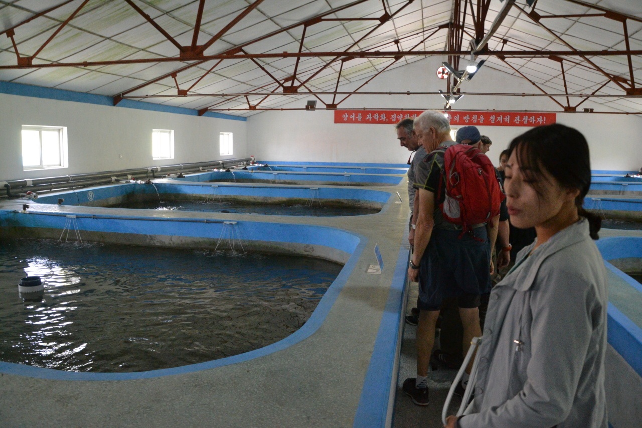 Jedeme do přilehlého čínského kasina, kde máme půl hodiny přesně na to, abychom si tu nic nekoupili, protože kasino už každý viděl a restaurace je ještě zavřená. Ale záchody tu mají solidní. Čekáme na Godoty, resp. na průvodce, kteří se někam zašili. Jdeme si prohlédnou jakési sádky. Asi. Prostě jsme tu zastavili, vyhnali nás z busu, a pak nahnali zpět. Nikdo se s náma nebavil. Nevíme proč tu jsme, místní možná ví, proč tu jsme. Asi se máme dívat na ryby. Všichni to tak dělají. Dokonce i Kim Jong-Un is looking at fish.