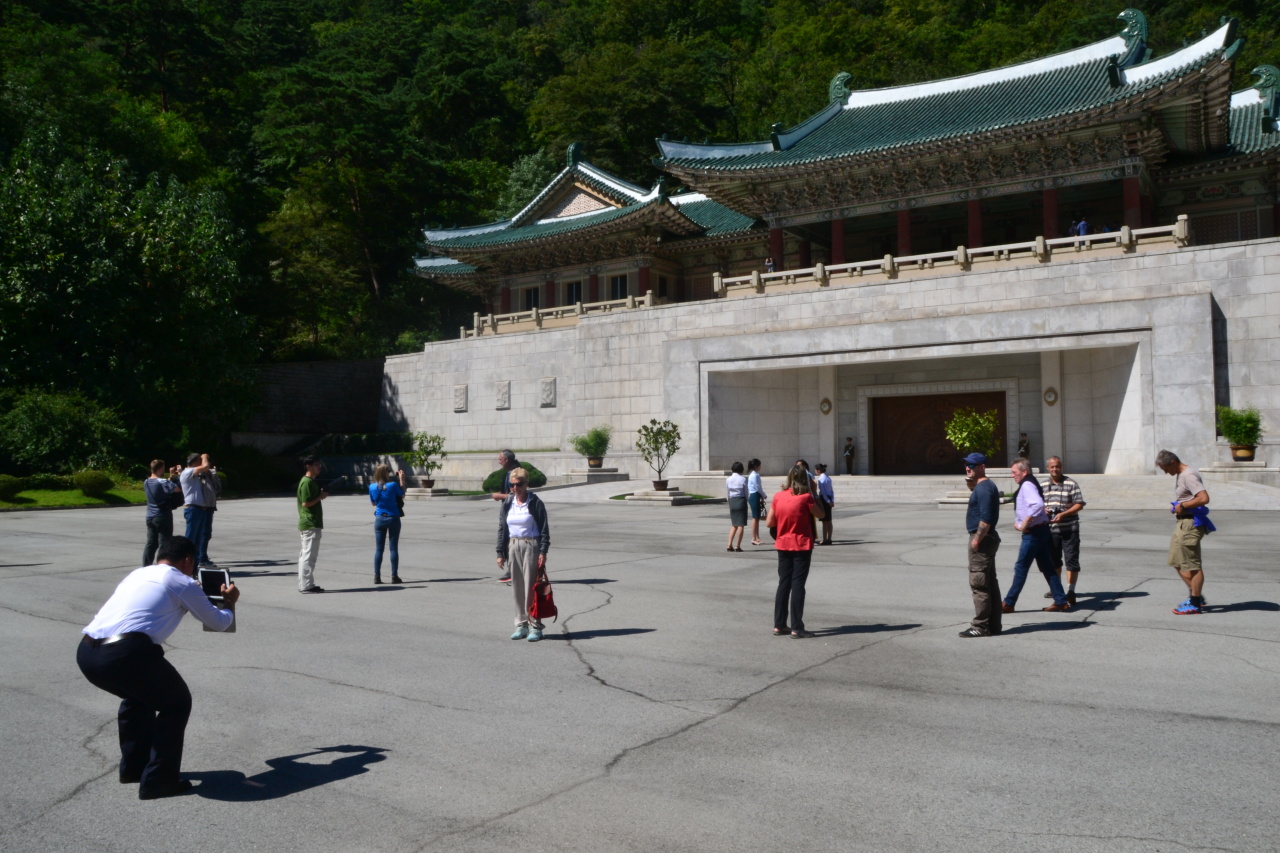 U muzea se uvolnilo místo, tak jdeme dovnitř, do hlavní budovy s dary pro Kim Ir-Sena, jeho manželku, a Kim Čong-Una. Spekuluje se, že po obědě si budeme moci zvolit, zda chceme vidět i druhou budovu (což bych rád) nebo půjdeme na hike, což bych taky rád, ale asi vyhraje druhá budova. Z nějakého důvodu nás (nenápadně) z hlavní budovy vykázali asi po třech místnostech, takže jsme viděli celkem prd (kromě obligátního Ortegova krokodýla nesoucího kalíšky na chlast). Novinkou jsou tady portréty mladého Kima se světovými lídry: Trumpem třeba. Jdeme tedy rovnou do druhé budovy kde procházíme velkou část sbírek darů z Číny a pak většinu Evropy (je tu i vitrína darů z Československa a pak společná vitrína pro dary z Česka a ze Slovenska, a hlavně pak Francii, Německo a Rakousko. Mezi dary z Rakouska je recesistický suvenýr "sněhová koule" v hodnotě tak 90 centů, a pak hrnek výročí nějaké komunistické partaje tak za dvě éčka. Tři dny do Kima a Leea vandruju, že chci vidět druhou budovu. Možná, uvidíme, asi to nepůjde. Nejde to. Alternativa. Všichni povinně. Plány se tady mění každým okamžikem. V zemi se něco děje. Asi nějaká důležitá návštěva v hlavní budově.