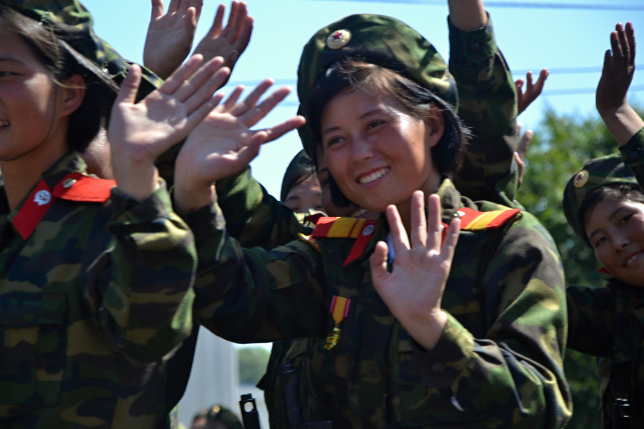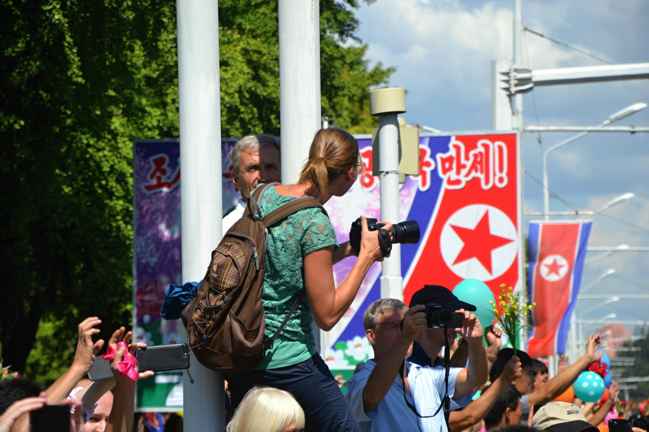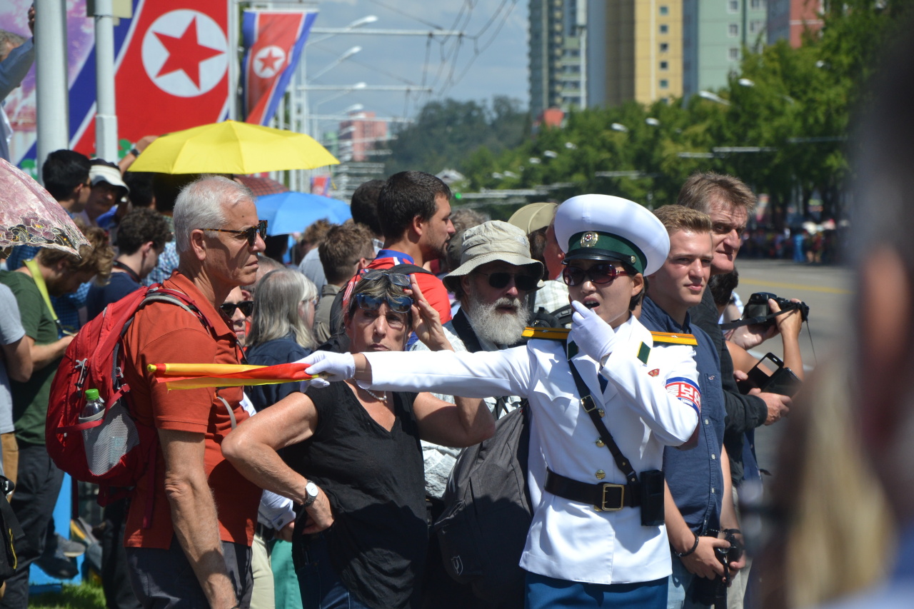 Z vyhlídky v parku vidíme na město. Pchjonghattan. Slyšeli jsme nějaká letadla a viděli pofiderní denní ohňostroj. Je evidentní, že cílem je dostat nás co nejdále od vojenské přehlídky v centru. Scházíme zpět k autobusu zaparkovaného u vstupu do zábavního parku. Chtěli bychom dovnitř, ale musíme zase do busu. A přichází zásadní zpráva dne: jedeme na vojenskou přehlídku. What the... nejdřív jo, pak ne, pak mejbí, pak zase ne, teď zase jo. A level 2: Nemůže se fotit, může se fotit, mejbí, všichni fotí.