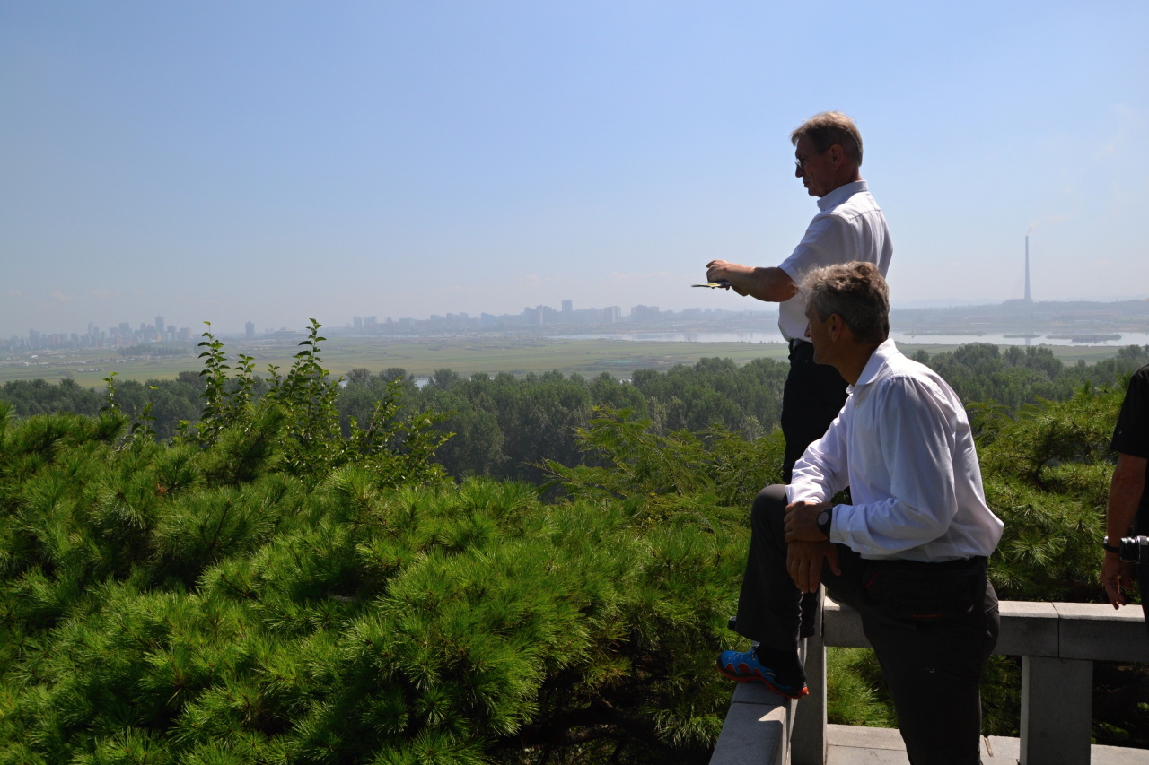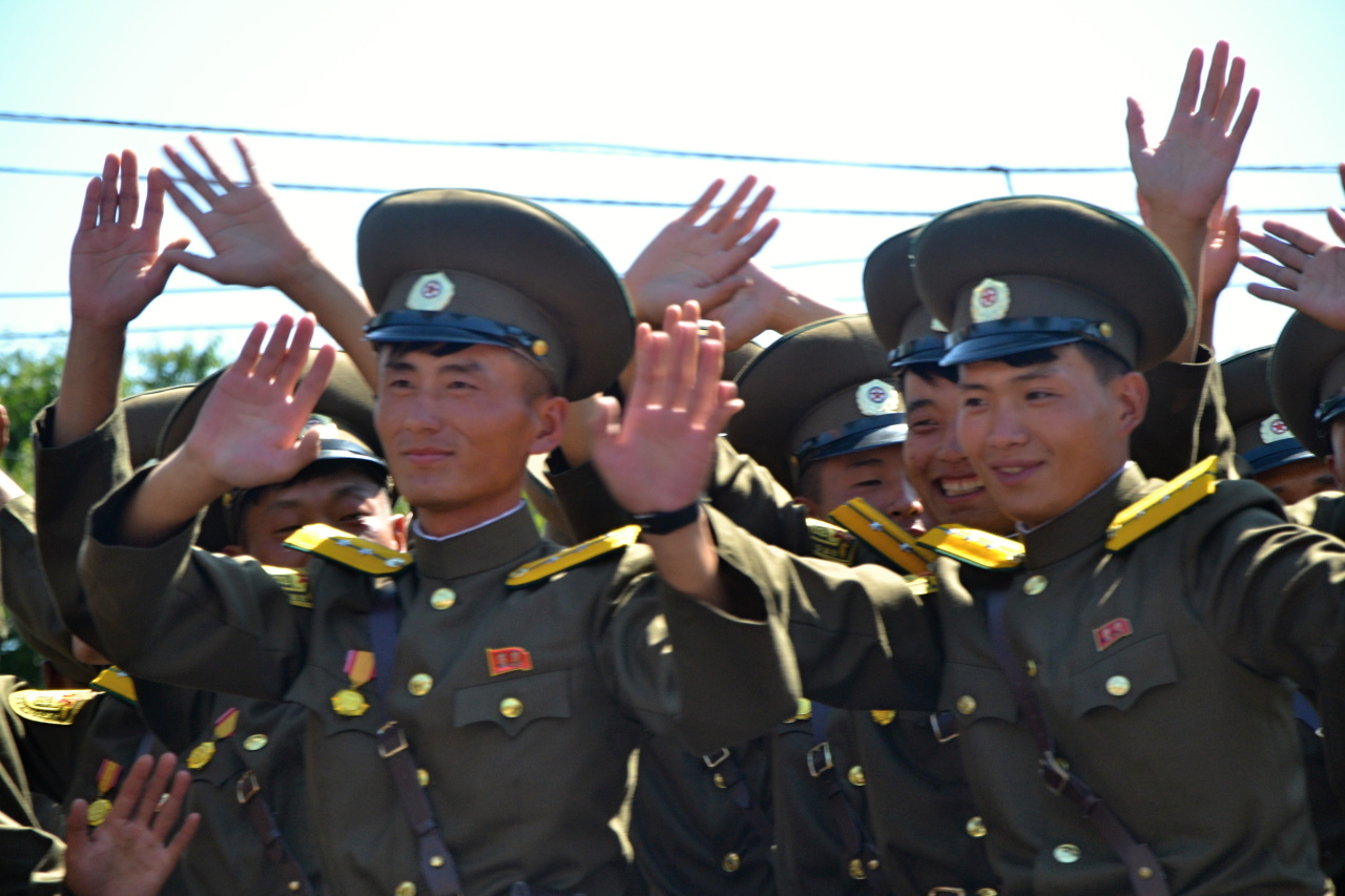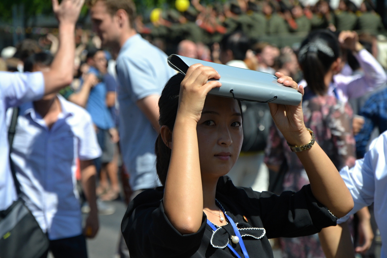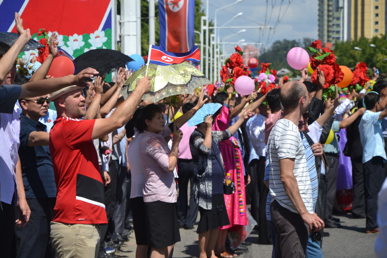 Z vyhlídky v parku vidíme na město. Pchjonghattan. Slyšeli jsme nějaká letadla a viděli pofiderní denní ohňostroj. Je evidentní, že cílem je dostat nás co nejdále od vojenské přehlídky v centru. Scházíme zpět k autobusu zaparkovaného u vstupu do zábavního parku. Chtěli bychom dovnitř, ale musíme zase do busu. A přichází zásadní zpráva dne: jedeme na vojenskou přehlídku. What the... nejdřív jo, pak ne, pak mejbí, pak zase ne, teď zase jo. A level 2: Nemůže se fotit, může se fotit, mejbí, všichni fotí.