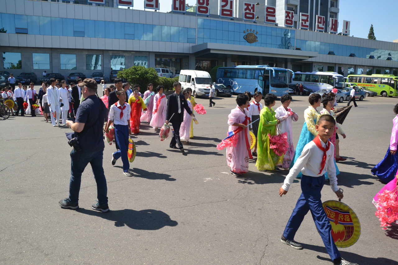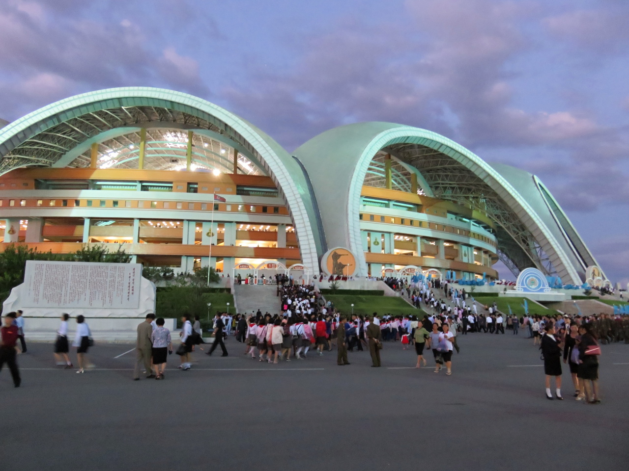Na parkovišti mají busy čísla. Náš má pětku. Dostáváme visačky s nápisem "1-5". Jedna je zvoucí organizace (KITC), pětka je číslo busu. Busy jsou před hotelem seřazené a jede se ve špalíru. K nám o pár ulic severněji se přidávají další busy z dalšího hotelu a pak zastavujeme na parkovišti u budovy opery. Šedesát očíslovaných busů. Čekáme. Pak smíme do opery na záchod (jednoznačně největší záchody, jaké jsem viděl, tak padesát pisoirů a desítky kabinek) a zpět do busu. Čekáme. Ven z busu. Kontrola busů. Čekáme. Dostáváme pasy a vstupenky. Juhů. Čekáme v busu. Dostáváme přiděleného vojáka do busu. Odjezd. Kolona, policie řídí dopravu, nikde se nezastavuje (červená, kruháč, přechody pro chodce, všechno je řízené) a přijíždíme na ostrov se stadiónem 1. května, kde se pořádá "Arirang" (teď to tak nějak oficiálně nemá jméno jako takové, představení se jmenuje "The Glorius Country", říká se tomu prostě Mass Games).