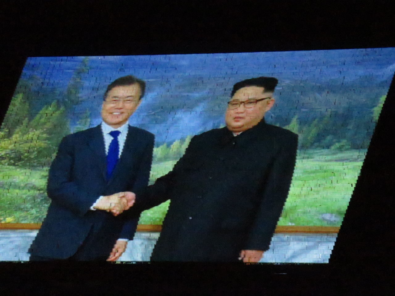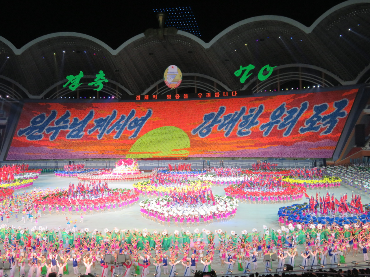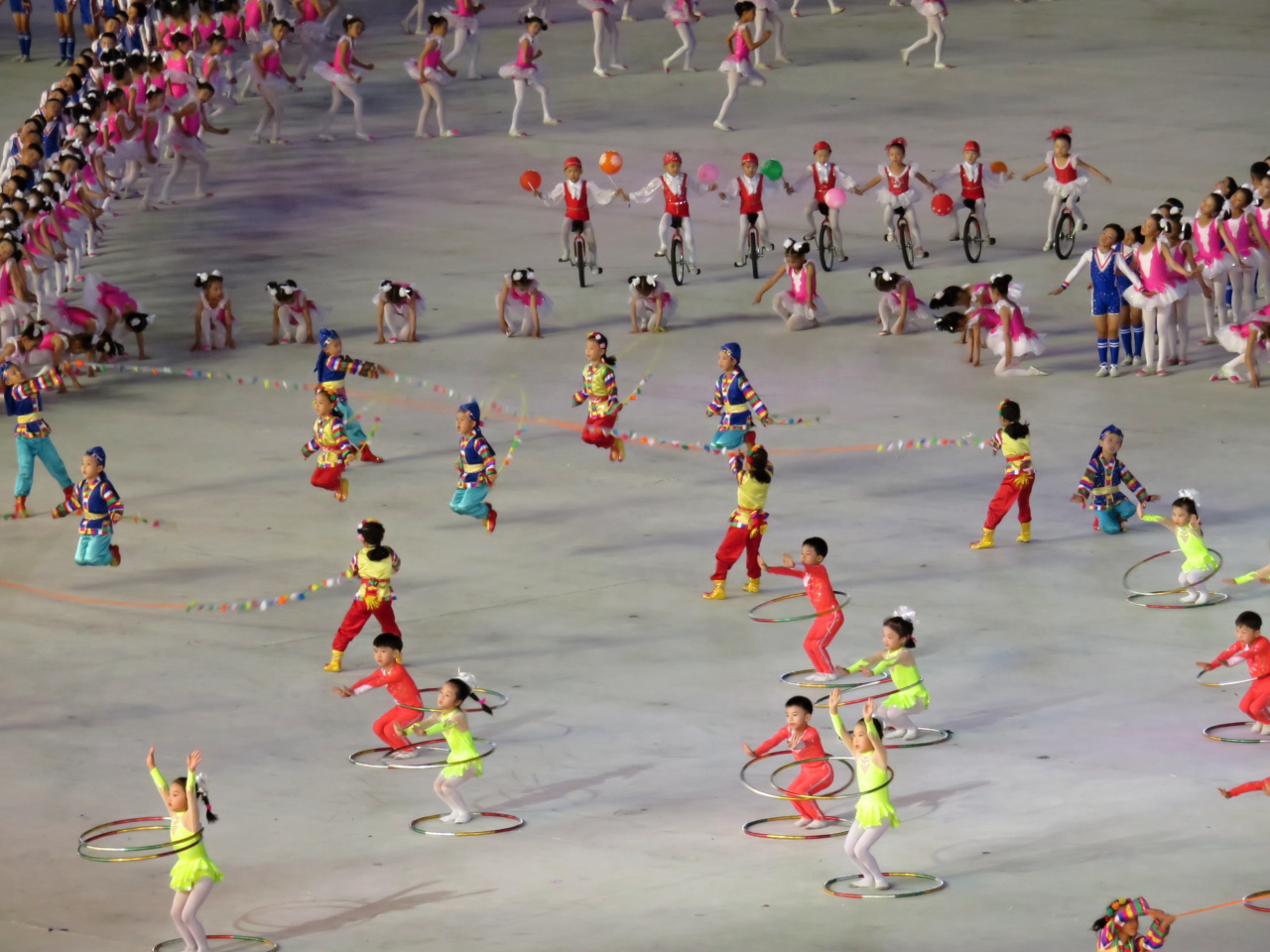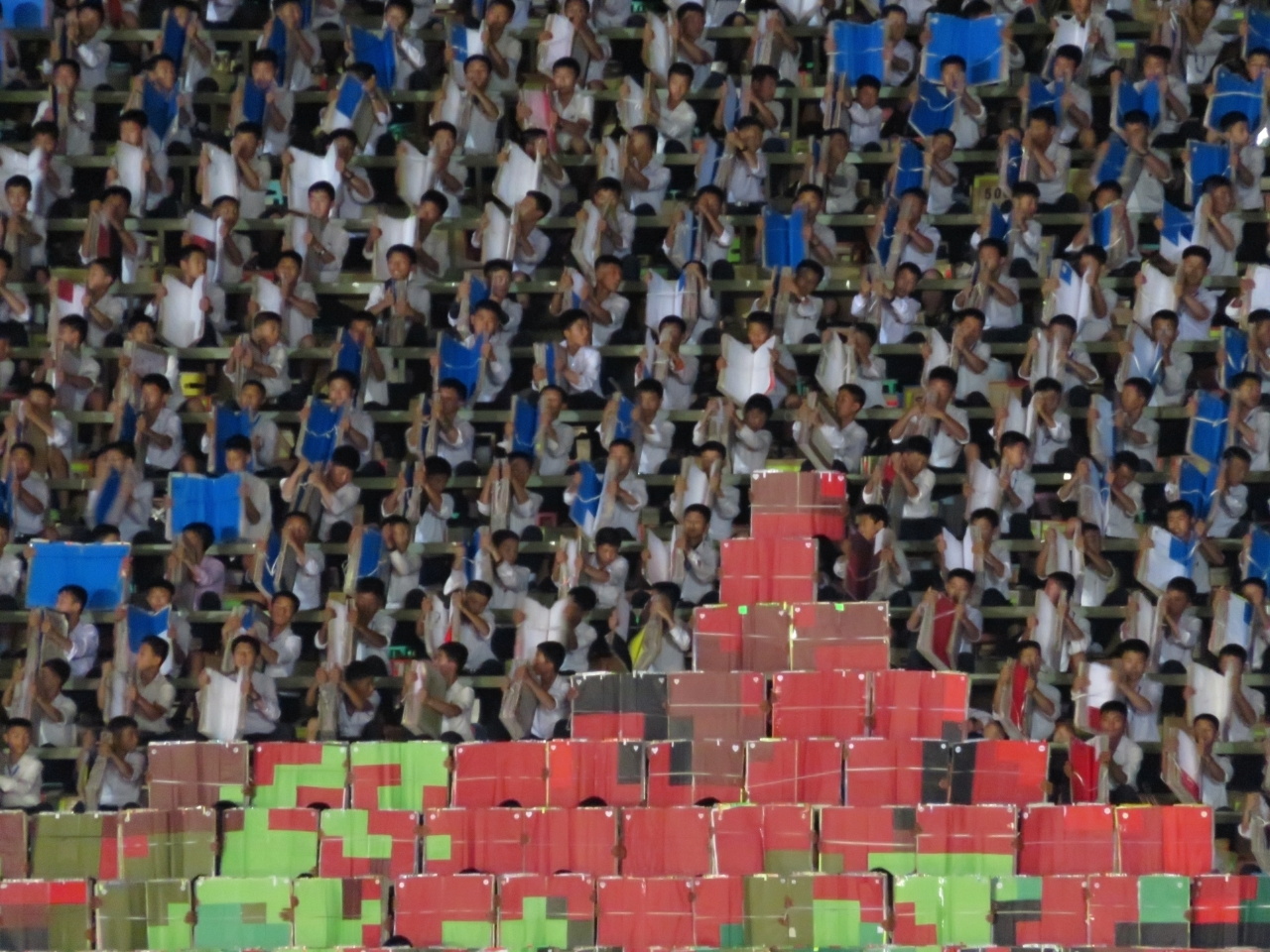 Samotné představení asi popíšu jenom krátce. Bylo to něco na způsob zahájení olympijských her, ale větší. Mělo to tři dlouhá dějství věnovaná důležitým událostem z života Kim Ir-Sena, Kim Čong-Ila, a Kim-Čong-Una, a dvě kratší věnovaná sjednocení Koreje a mezinárodním vztahům. A pak samozřejmě úvod a závěr. Kromě klasických 17400 obrázkových knih v rukách dětí vytvářejících obří živou obrazovku a gymnastů, tanečníků, zpěváků, hráčů na různé nástroje a armády přibyly fičury jako videomapping, barevně svítící drony, ohňostroj a tak.