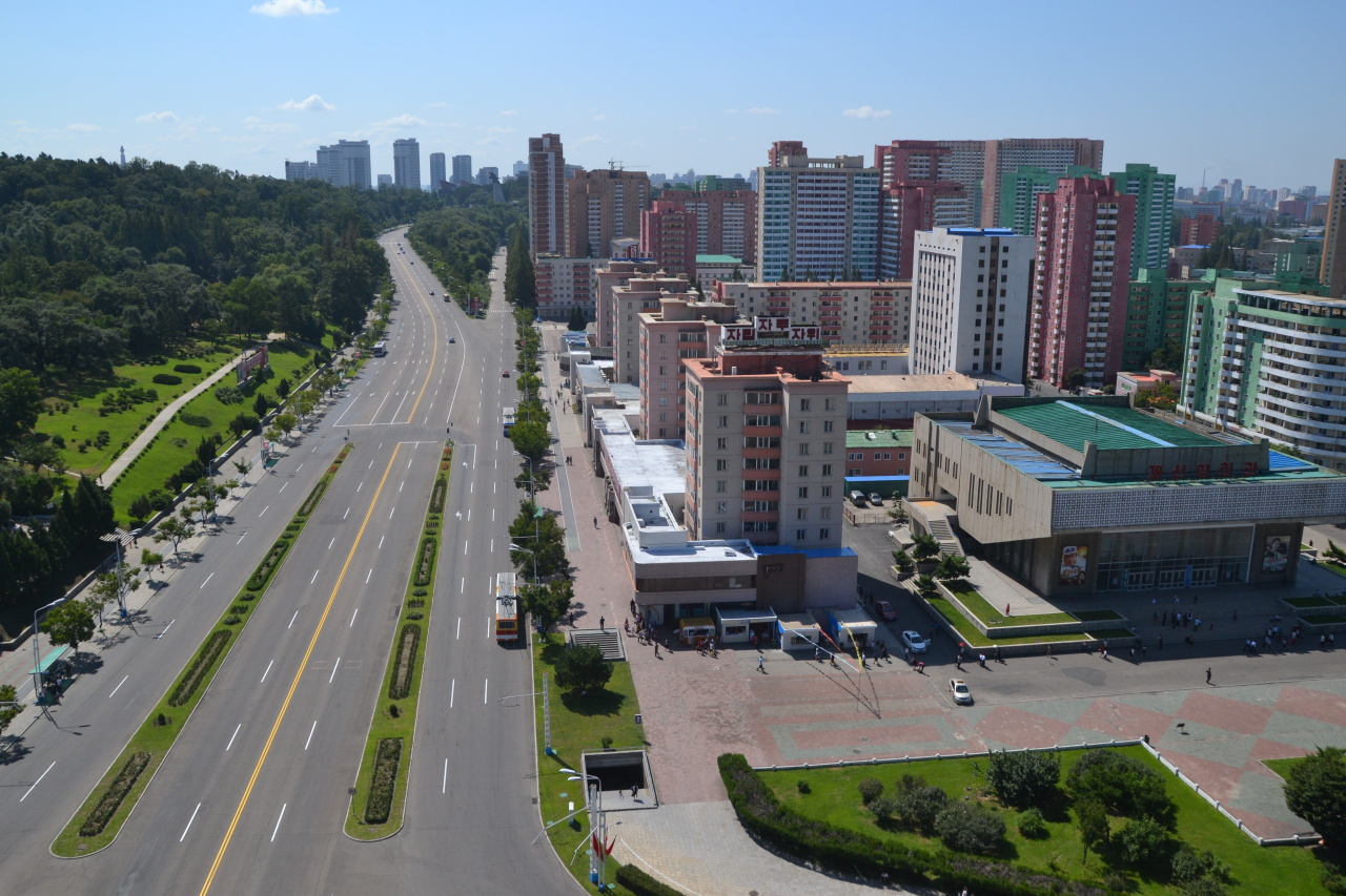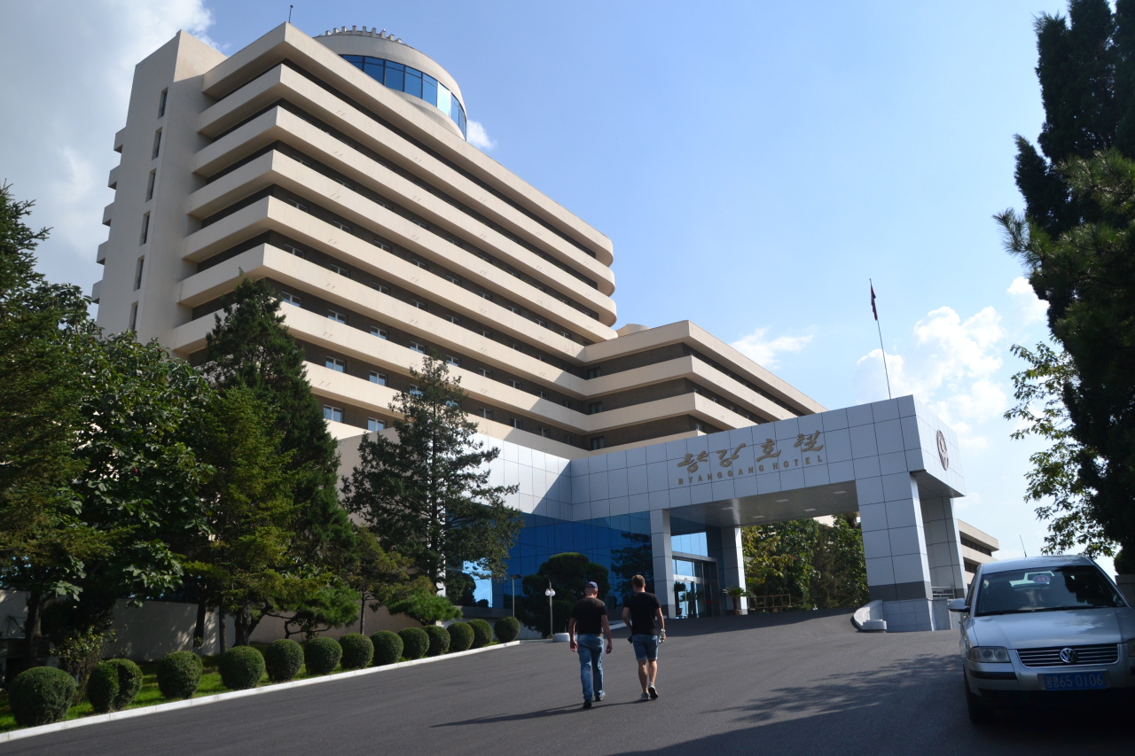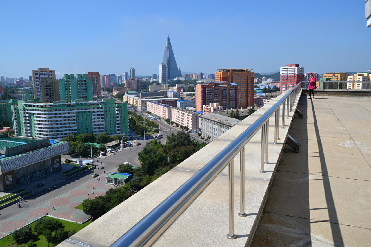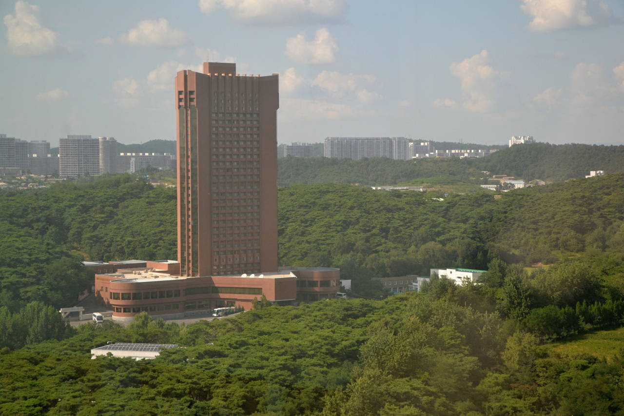 Nevadí, jdeme na procházku. Průvodci musí být evidentně dva, protože přestože Rus zůstal na hotelu, jde s náma (čtyřma) Kim a jeho průvodce. V hotelu Ryanggang dáváme vyhlídku, ale je to přes sklo. Dobré, ale ne na focení. Pak jdeme na sever, do hotelu Cheongnyeon, kde dáváme na baru colu, kolega Hans platí za Kima a já za ruského průvodce. Už mě to nebaví. Asi kluci nedisponují západní valutou.
