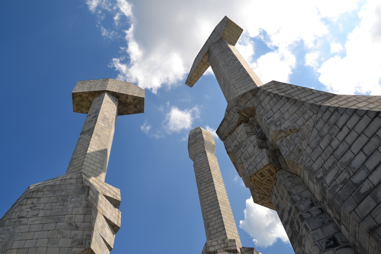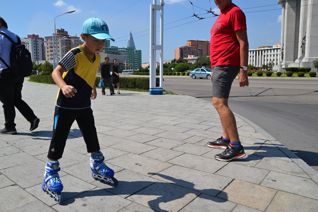 Kim Ir-Senovo náměstí je stále zapovězeno, centrum města je prostě pro turisty nepřístupné. Jedeme na vítězný oblouk, sice platíme vstupné 2€, ale stojí to za to. Vevnitř nic moc, ale je tu hezký výhled na město ze střechy, žádné sklo, hodně místa, pohodové focení.